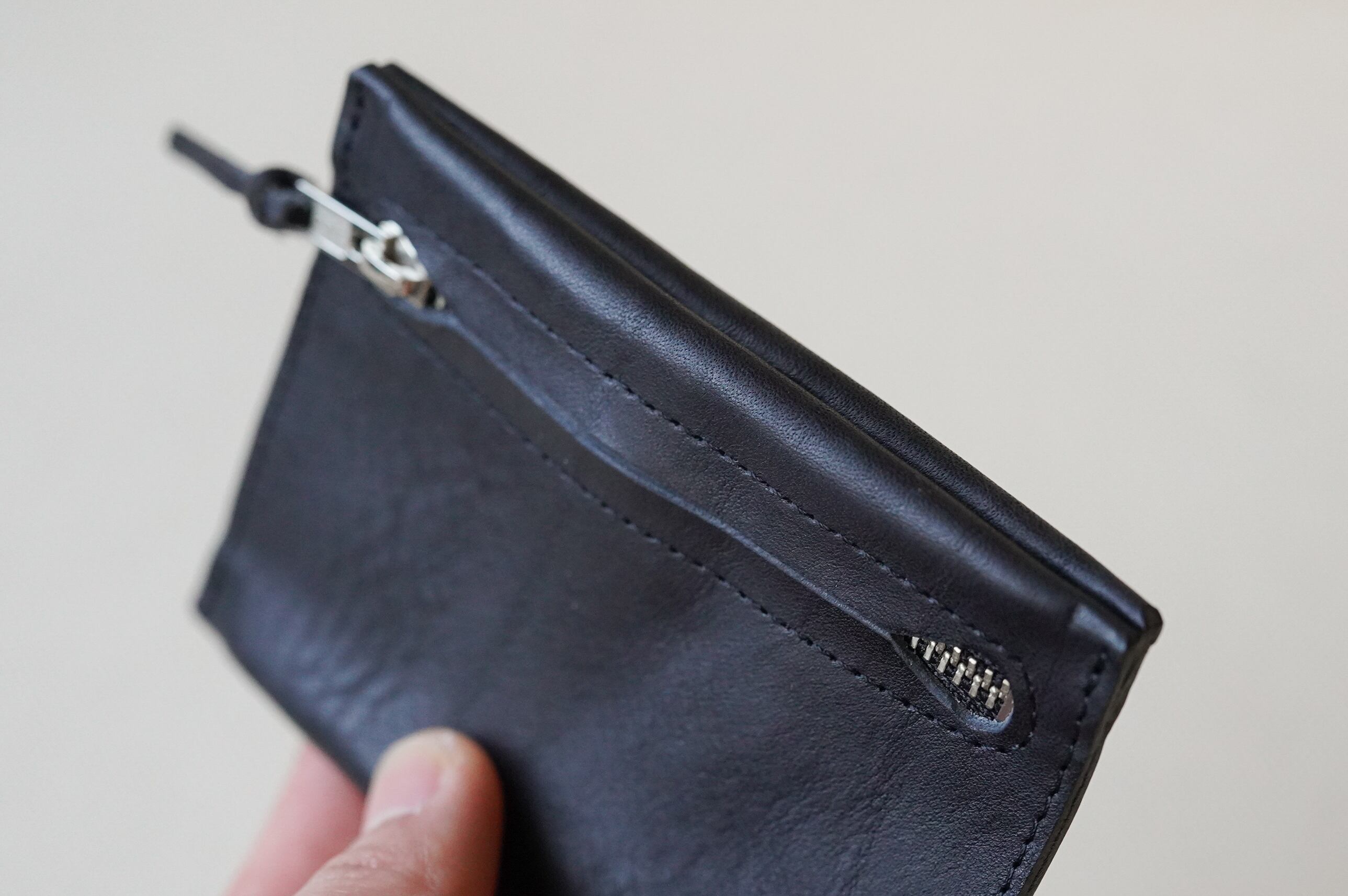 横に開くファスナーは閉じたら隠れるように。